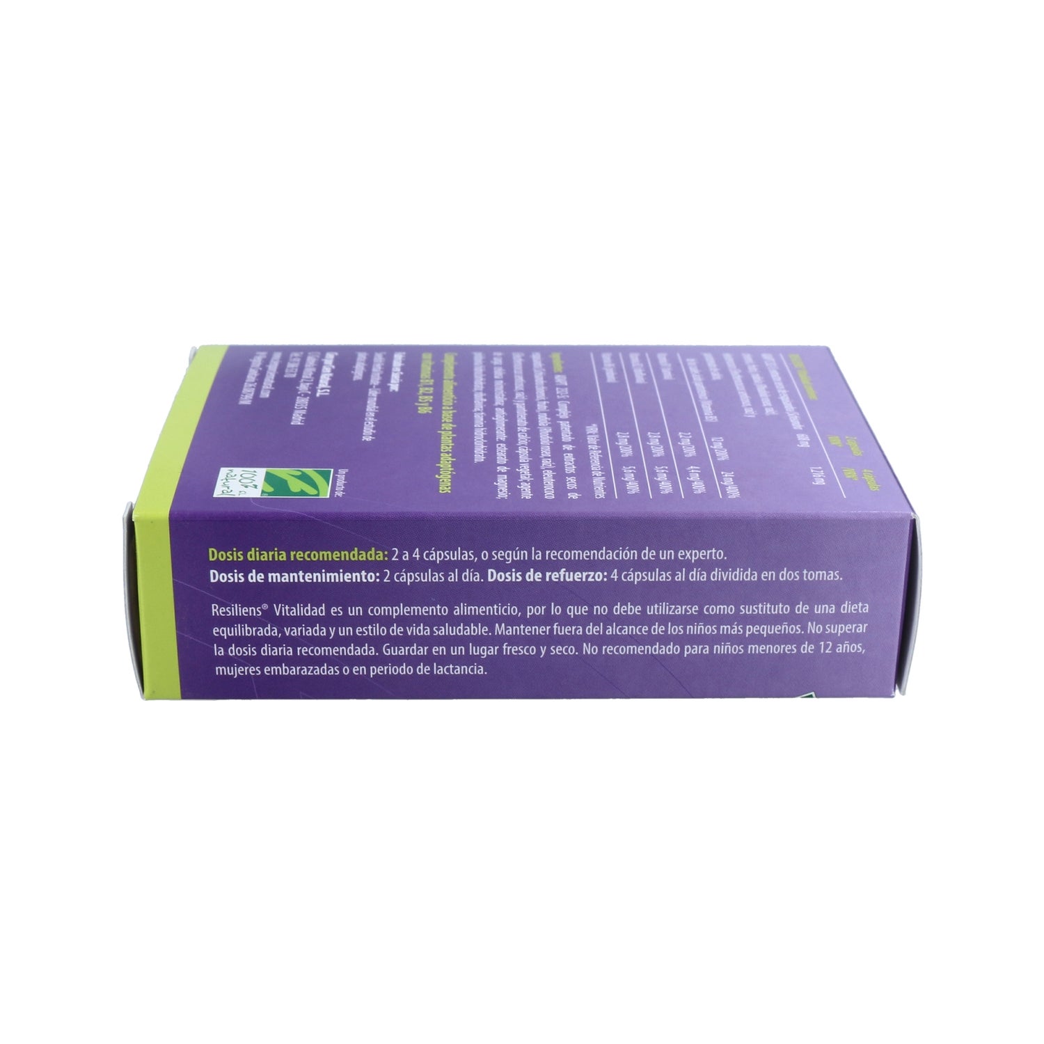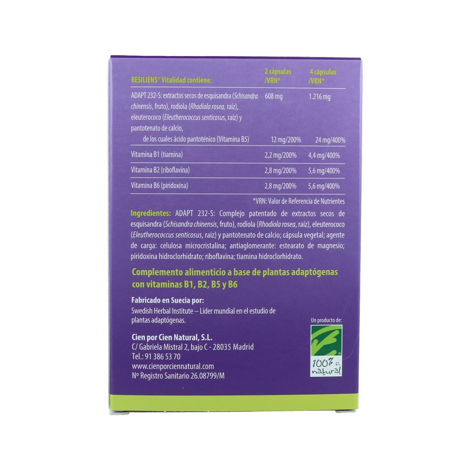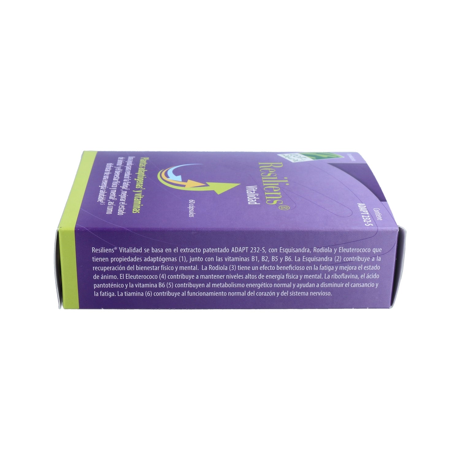 Complément 100% naturel Resiliens Vitalité spécialement conçu pour réduire la fatigue et améliorer ainsi notre bien-être physique et mental. Sa formule brevetée ADAPT-232S est composée de plantes adaptogènes : Equisandra, Eleutherococcus et Rodiola, ainsi que des vitamines B1, B2, B5 et B6, qui aident à réduire les effets du stress en améliorant notre humeur et en augmentant notre énergie.