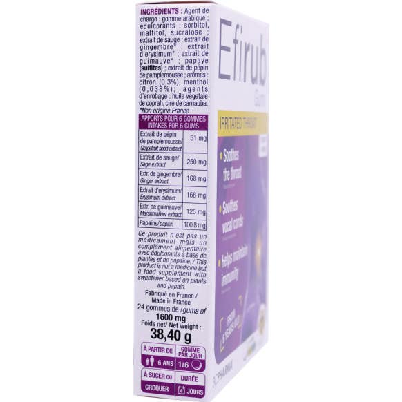 Ces gommes, qui présentent un agréable goût de citron et de menthe, offrent une expérience réconfortante à chaque prise. Efirub se compose d'ingrédients tels que :