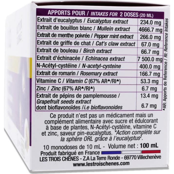 De plus, l'eucalyptus, associé au plantain et à la menthe, procure un effet réconfortant sur les voies respiratoires, facilitant le nettoyage des tubes bronchiques et soulageant les gorges irritées. Sa combinaison d'ingrédients génère :