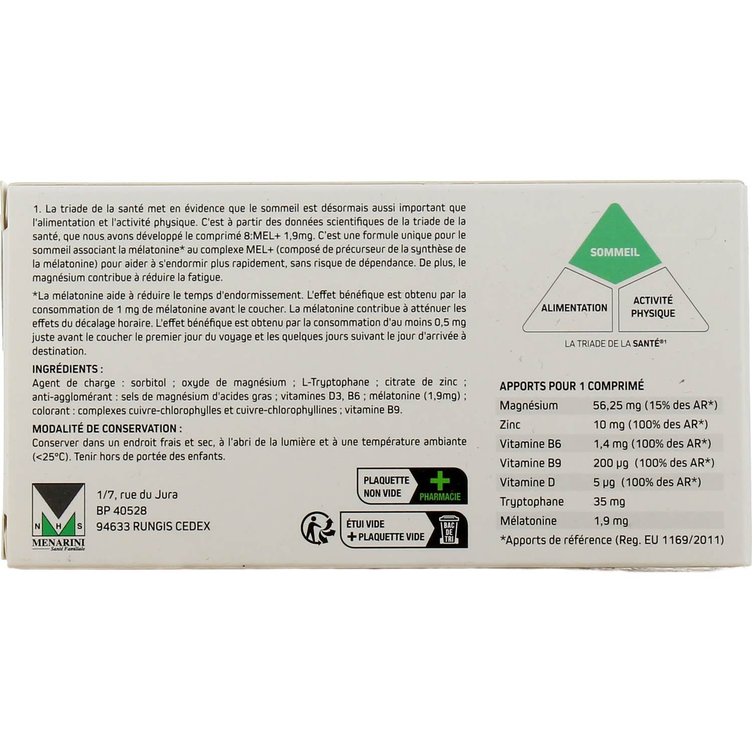8:MEL+ Mélatonine 1mg 30comp est un complément alimentaire qui contient de la mélatonine et un complexe MEL+, qui inclut des précurseurs de la synthèse de mélatonine. Sa formulation est conçue pour faciliter un endormissement plus rapide, sans risque de dépendance.