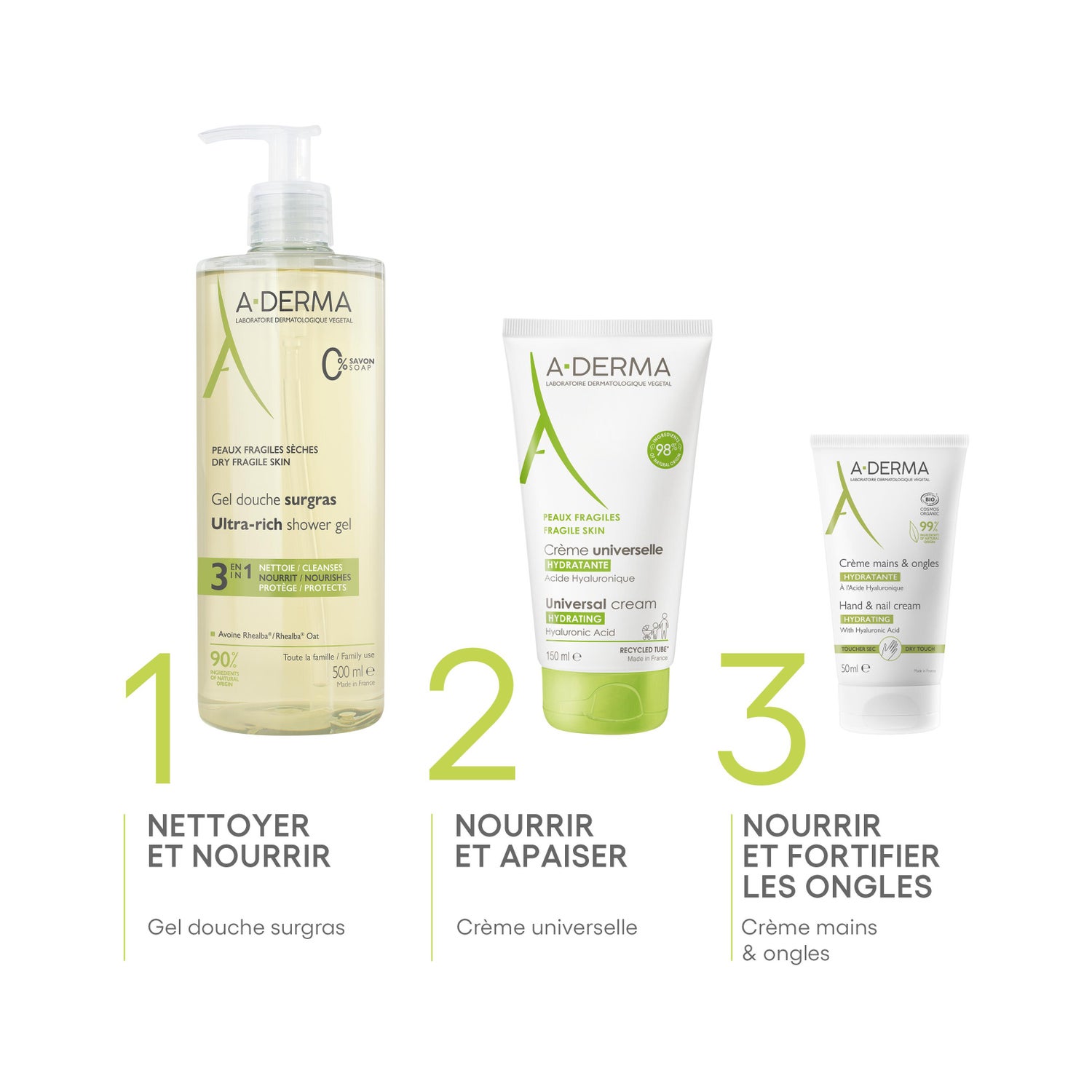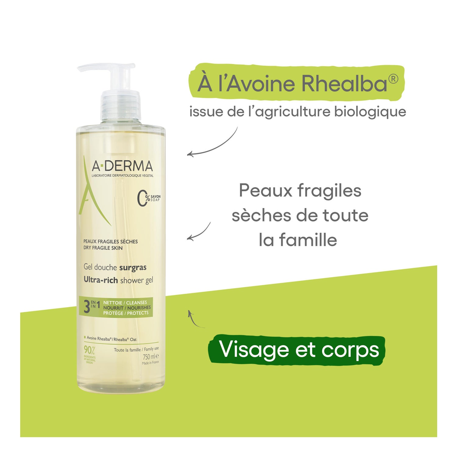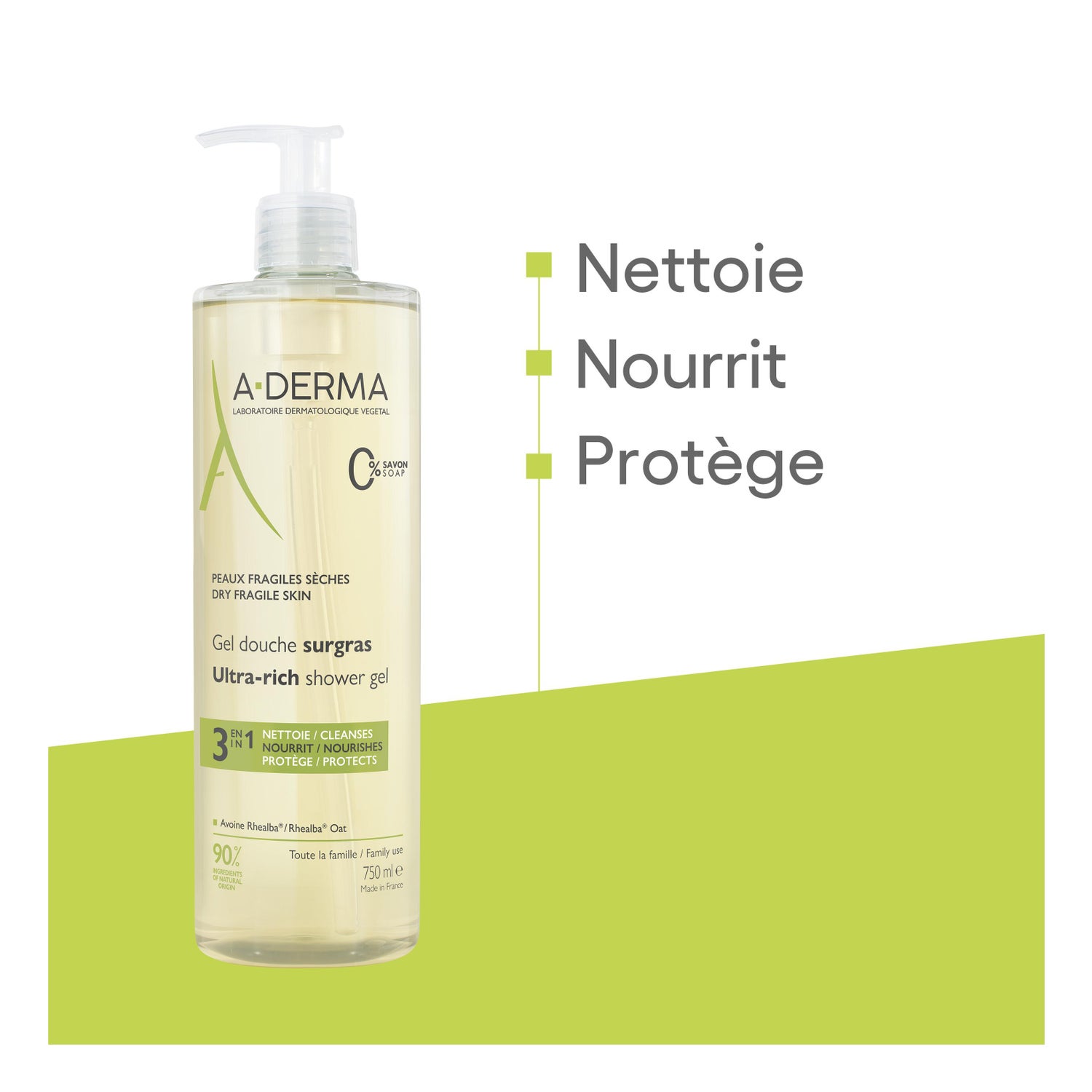 A-Derma Gel de Douche Surgras Ultra Riche 750ml est un nettoyant doux qui possède de nombreuses propriétés pour l'hygiène quotidienne de ta peau.
