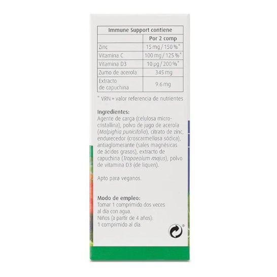 Complément alimentaire à base d'acérola, de capucine, de zinc et de vitamine D issus de l'agriculture biologique. Convient aux végétaliens. Soutient le fonctionnement normal du système immunitaire. On attribue à ses ingrédients des propriétés antioxydantes et équilibrantes. Convient aux adultes et aux enfants de plus de 4 ans.