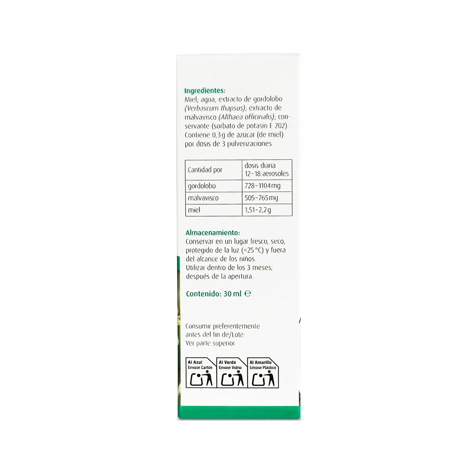 Contient 0,3 g de sucre (issu du miel) par dose de 3 pulvérisations.
