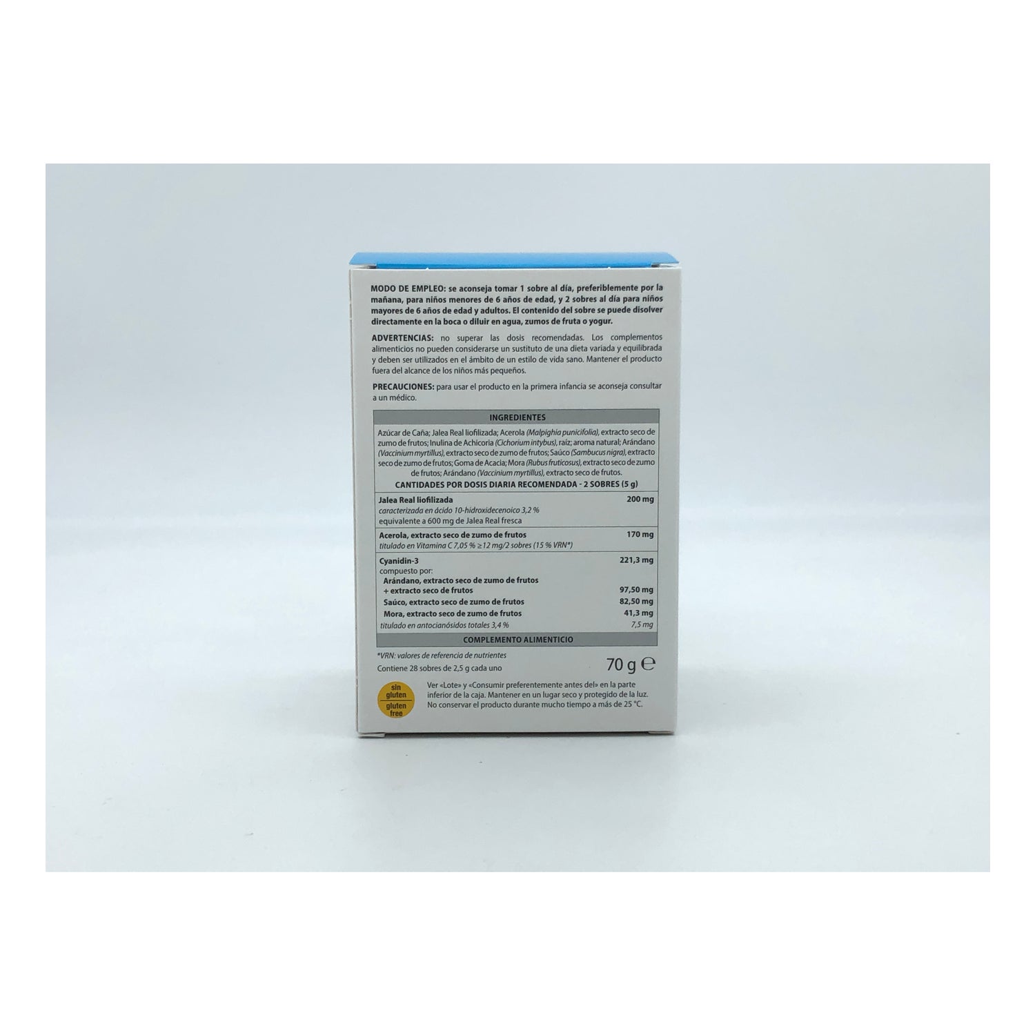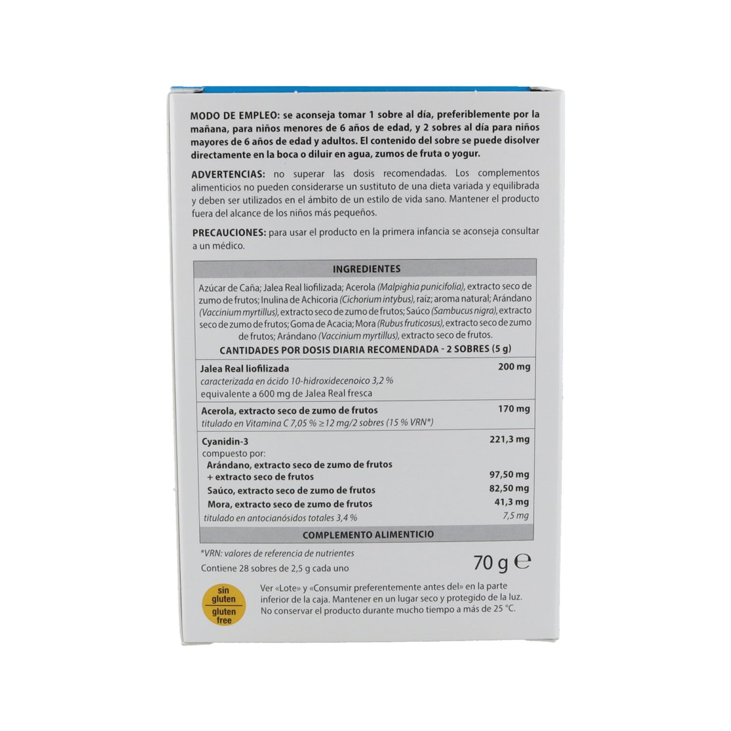Sa formule composée de gelée royale, de jus d'acérola, et de l'association de fruits rouges, contribue à une action de soutien et de restauration, apportant énergie et vitalité de manière naturelle, aidant à éviter la fatigue et la lassitude causées par des situations de stress ou de pression atmosphérique.