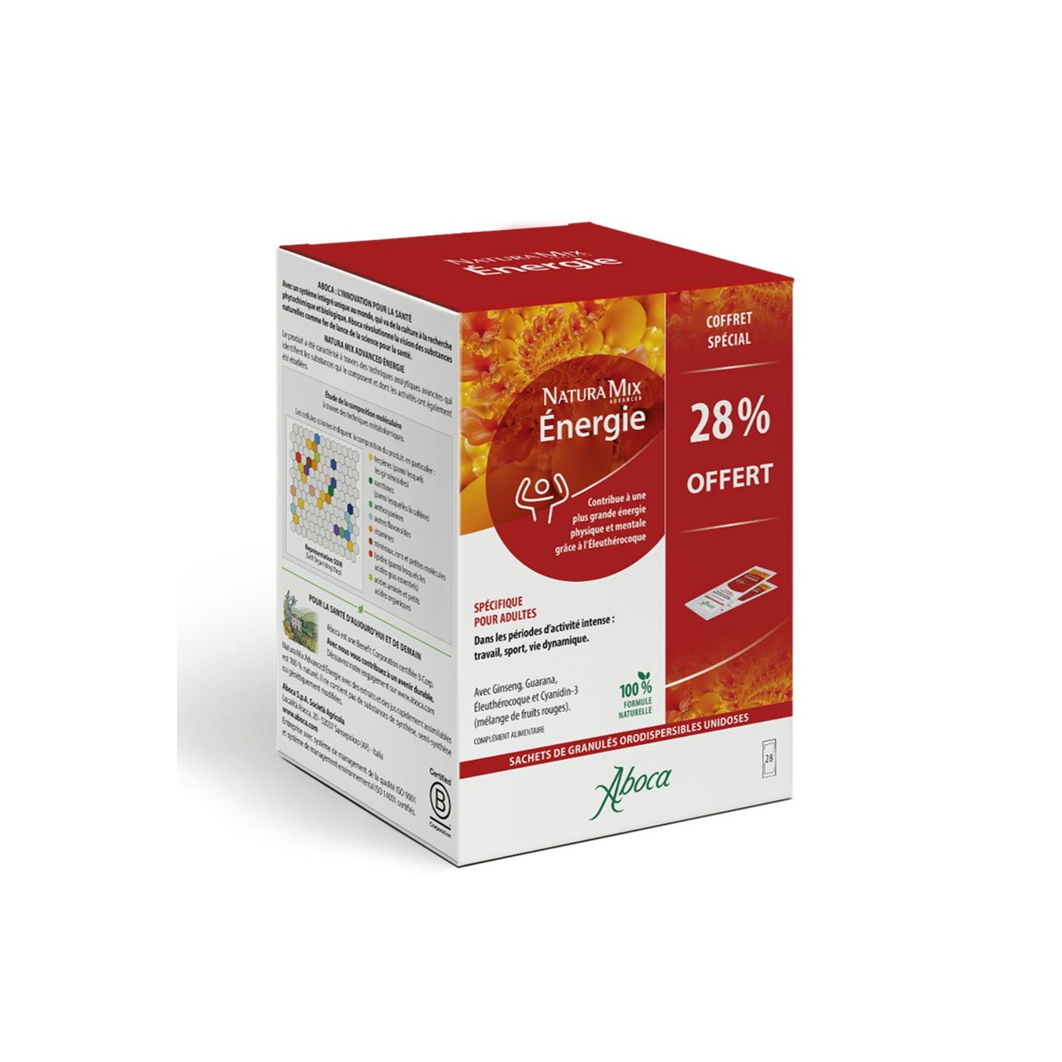 Aboca Natura Mix Advanced Energy 28 sachets est un complément alimentaire 100% naturel qui aide à contrer le manque d'énergie, tant physique que mental, surtout en période d'activité intense au travail, de sport ou de vie dynamique.
