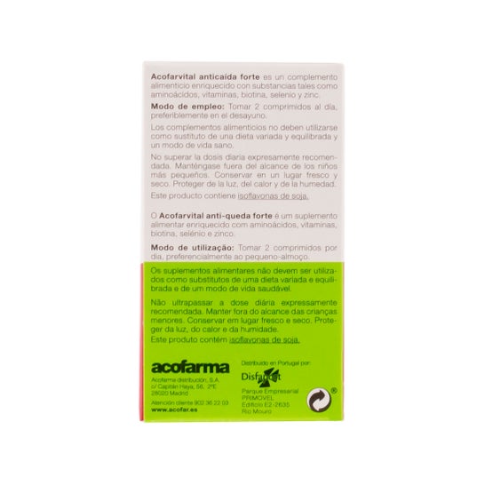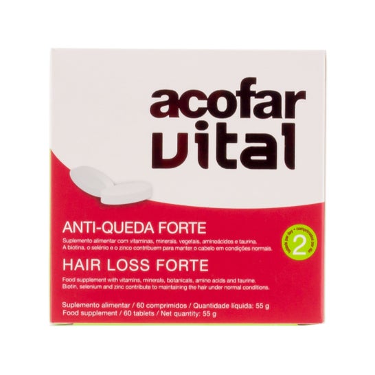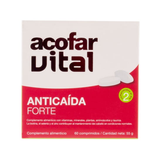Acofarvital antichute forte 60comp est un complément qui agit comme un traitement contre les chutes. Il aide à réduire et à arrêter la chute des cheveux et permet d'augmenter leur volume. Grâce à ses acides aminés, ses vitamines, sa biotine, son sélénium et son zinc, ce complément alimentaire fournit une variété de nutriments essentiels pour que le cuir chevelu se régénère correctement et qui facilitent la coiffure, tout en apportant de la brillance et une apparence saine.