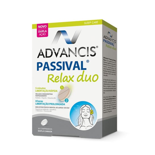Advancis Passival Relax Duo est un complément alimentaire qui se présente sous forme de comprimés à libération modifiée. Ce produit est conçu avec une technologie innovante à deux couches, qui se décomposent à des vitesses différentes. Cette caractéristique permet de combiner les avantages d'une libération rapide et prolongée, offrant une action relaxante immédiate et un soutien au bien-être physique et mental tout au long de la journée.