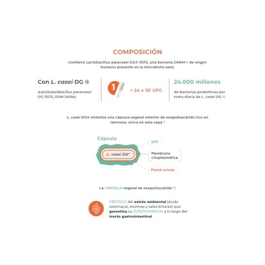 Il contient Lactobacillus paracasei DG® I1572, une bactérie GRAM + d'origine humaine présente dans la microbiote saine.