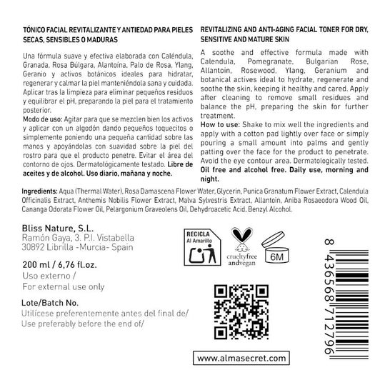 Alma Secret Facial Toner Revitalising Anti-Ageing Calendula & Pomegranate 200ml est un tonique pour le visage qui aide à apaiser et à régénérer la peau grâce à des extraits de calendula, de mauve et de camomille infusés dans de l'eau thermale. Il contribue également à maintenir l'hydratation de la peau et à adoucir les peaux sujettes au dessèchement. Il est également enrichi en hydrolat de rose et en extrait de grenade, des ingrédients riches en antioxydants qui facilitent la régénération des tissus cutanés. Formulé sans alcool, il ne dessèche pas. Contient 200ml.