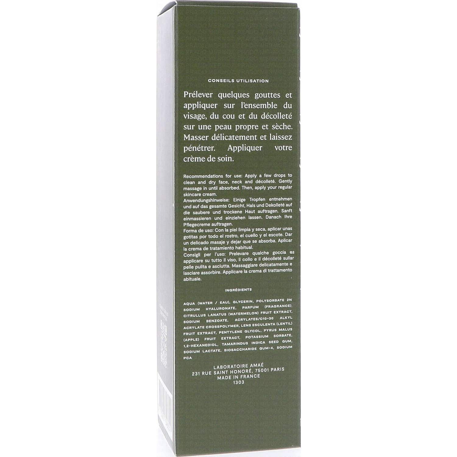 Les ingrédients incluent de l'eau, de la glycérine, de l'extrait de fruit de pastèque, de l'extrait de fruit de pomme, de l'extrait de lentille, entre autres, qui contribuent à son efficacité. Il est important de suivre les instructions d'utilisation et de consulter un professionnel si tu as des doutes sur son application.