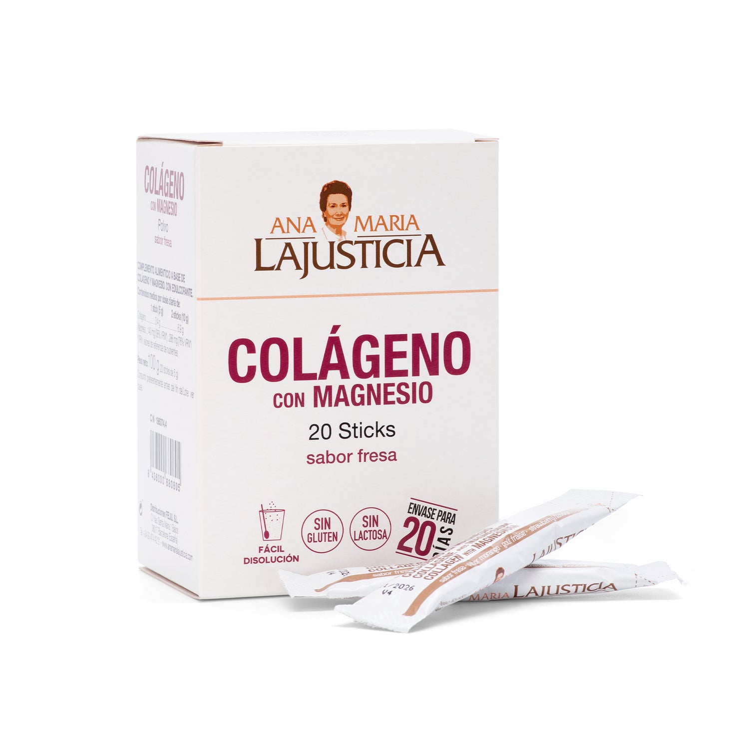 Ana Maria Lajusticia Collagène Magnésium Fraise 20 Sticks est un complément alimentaire sous forme de stick à base de magnésium et de collagène qui aide à maintenir les articulations de notre corps en bon état, ainsi qu'à améliorer la santé des os, des muscles et de la peau.