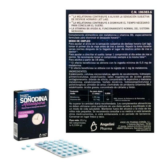 Un complément alimentaire à base de mélatonine 1,95mg et de vitamine B6. Aide à réduire le temps nécessaire pour s'endormir et à apaiser la sensation de décalage horaire. Contribue au bon fonctionnement du système nerveux, tout en favorisant un éveil énergétique. Favorise un sommeil réparateur et évite les réveils nocturnes inutiles. Convient aux adultes et aux enfants à partir de 12 ans.