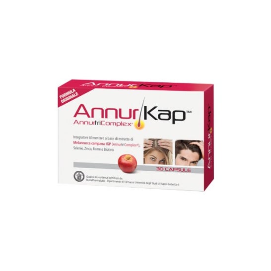 Annurkap est un complément alimentaire qui contient AnnutriComplex, un extrait naturel de melannurca, sélénium, zinc, cuivre et biotine. La melannurca est une variété de pomme riche en procyanidines oligomériques, originaire de Campanie. Ce complément est indiqué tant pour les hommes que pour les femmes.