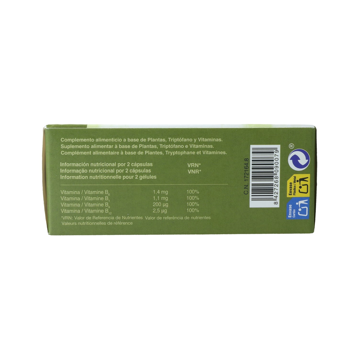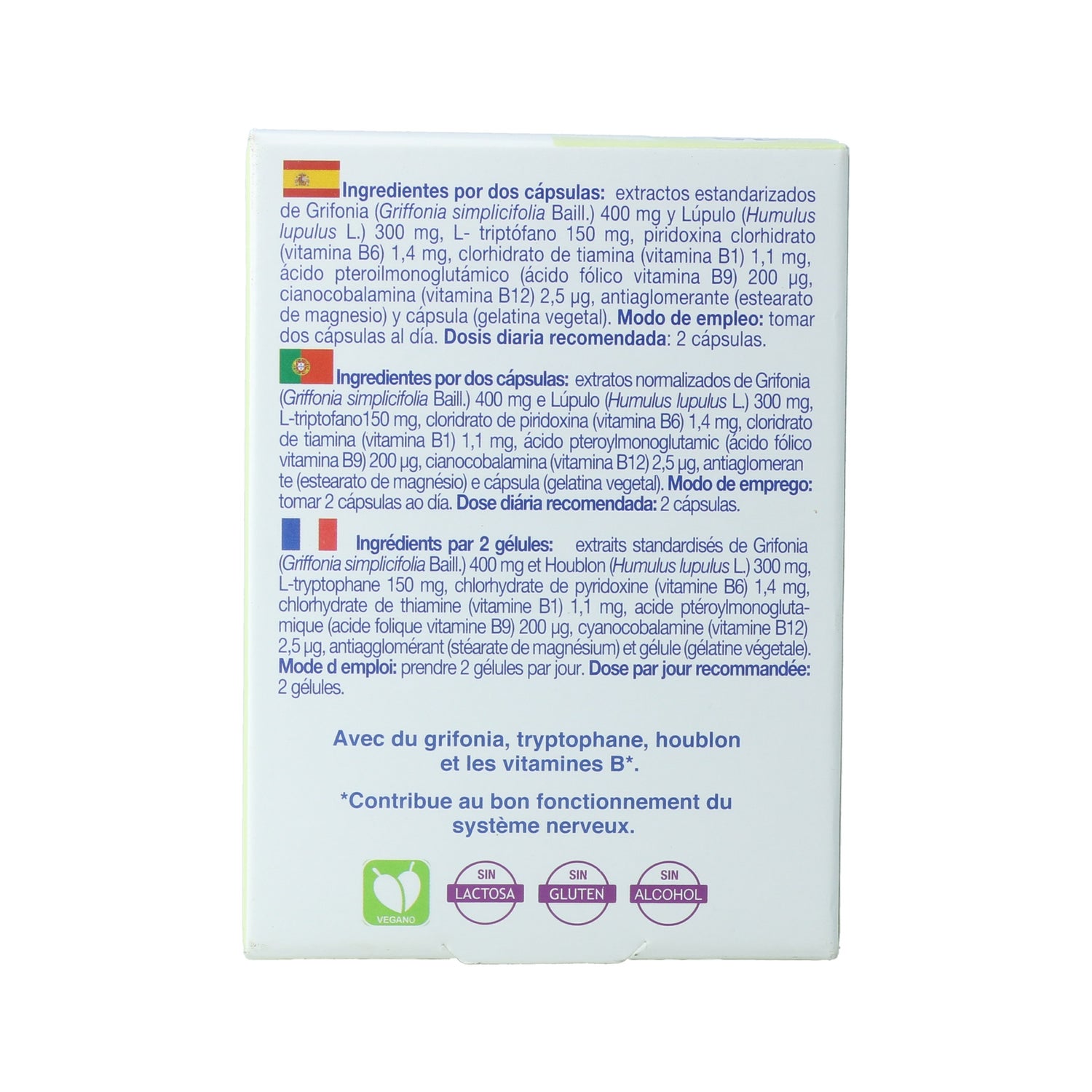 Extraits standardisés de : Griffonia (Griffonia simplicifolia Baill.) 400 mgHoublon (Humulus lupulus L.) 300 mgL- Tryptophane 150 mg Vitamine B6 1,4 mg (100% VNR*) Vitamine B1 1,1 mg (100% VNR*) Vitamine B9 200 μg (100% VNR*) Vitamine B12 2,5 μg (100% VNR*) Capsule (gélatine végétale).