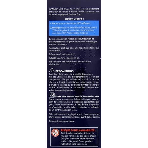 La lotion Apaisyl Xpert Plus agit en seulement cinq minutes, éliminant les poux et les lentes. De plus, elle offre une protection allant jusqu'à 72 heures contre de futures infestations grâce à son facteur de protection anti-poux. Cet ingrédient aide à maintenir les poux éloignés des cheveux, offrant une défense supplémentaire.