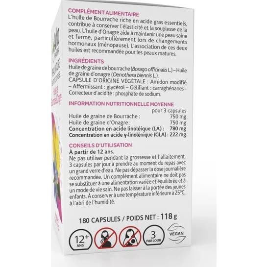 Associant 750 mg d’huile de graine de Bourrache à 750 mg d’huile de graine d’Onagre pour une concentration optimale en Acides Gras Essentiels, ce complément alimentaire contribue à nourrir la peau en profondeur et à retrouver confort cutané, souplesse et élasticité. Riche en acides gras essentiels, l’huile de bourrache aide à préserver l’élasticité et la souplesse de la peau. L’huile d’onagre soutient le maintien d’une peau saine et ferme, notamment lors des variations hormonales comme la ménopause.