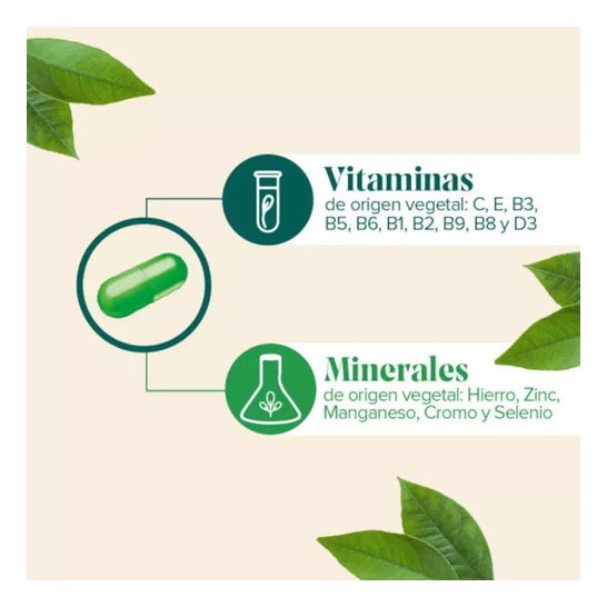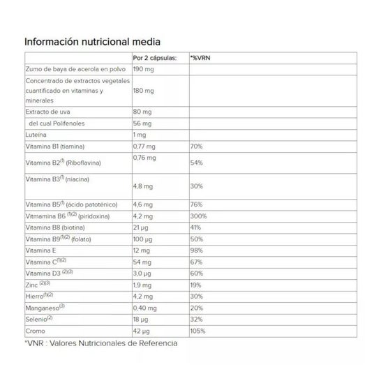 Grâce à son apport en fer, sélénium et zinc, ainsi qu'en vitamines B2, B3, B5, B6, B9 et C, ce complément aide à maintenir la vitalité et la forme. Il contribue également à protéger le capital osseux grâce à la vitamine D, au zinc et au manganèse, et à assurer une bonne vision, grâce à la vitamine B2 et au zinc. L'extrait de raisin, qui apporte des polyphénols, contribue à la protection des cellules. Enrichi en lutéine.