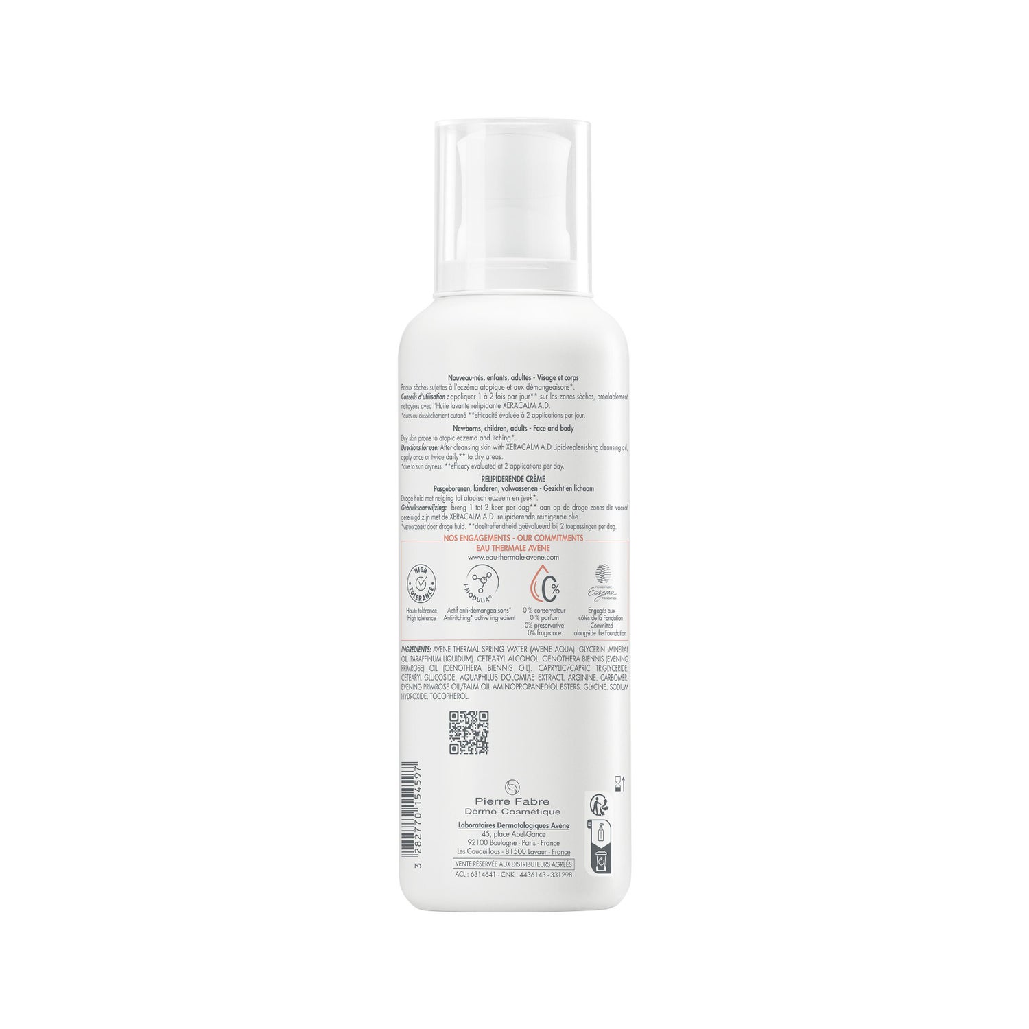 Avène XeraCalm A.D. Crème Relipidante 400ml est un soin qui permet de restaurer la fonction de la barrière cutanée et d'apaiser les sensations de démangeaison dues à la sécheresse de la peau.
