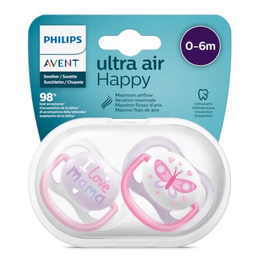 Lot de 2 sucettes Ultra Air, pour les bébés de 0 à 6 mois, équipées de trous plus larges qui maintiennent la peau autour de la bouche sèche, réduisant ainsi le risque d'irritation. Son bouclier brille dans le noir, ce qui le rend plus facile à trouver la nuit. Sa forme anatomique s'adapte parfaitement aux joues du bébé, respectant la forme naturelle du palais, des dents et des gencives, favorisant le développement bucco-dentaire.. ✓ La couleur et le design peuvent varier selon la disponibilité.