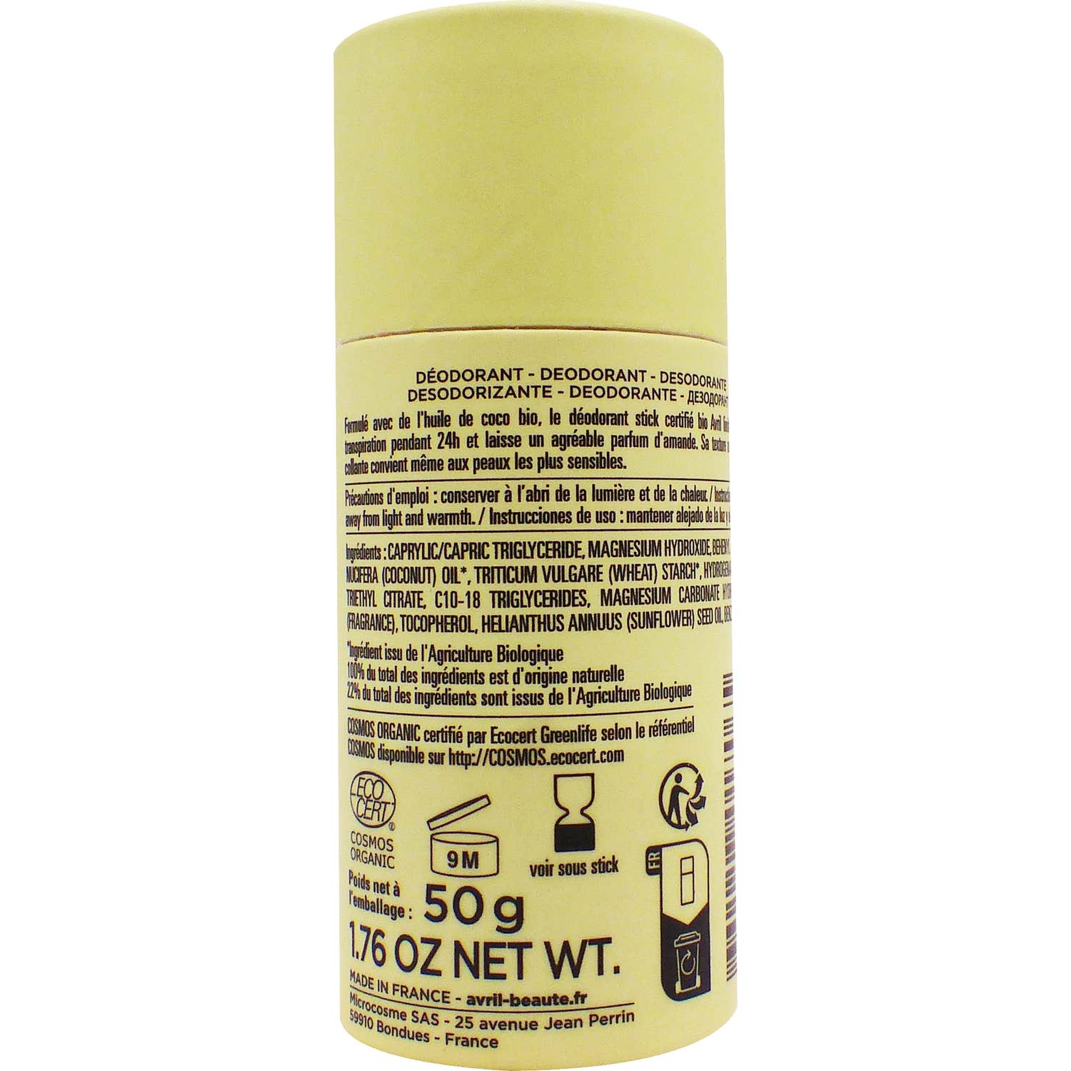 Ce déodorant bénéficie de la certification Cosmos Organic par Ecocert Greenlife, garantissant qu'il est élaboré à 100 % avec des ingrédients naturels, dont 22 % proviennent de l'agriculture biologique.