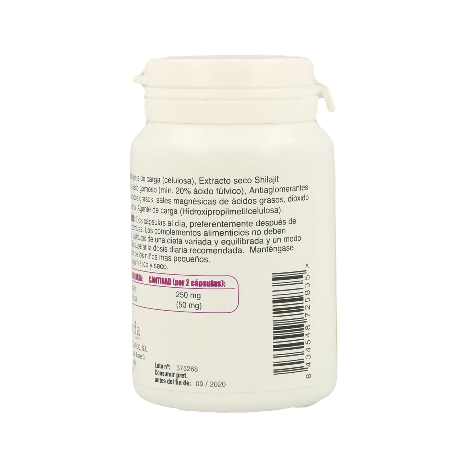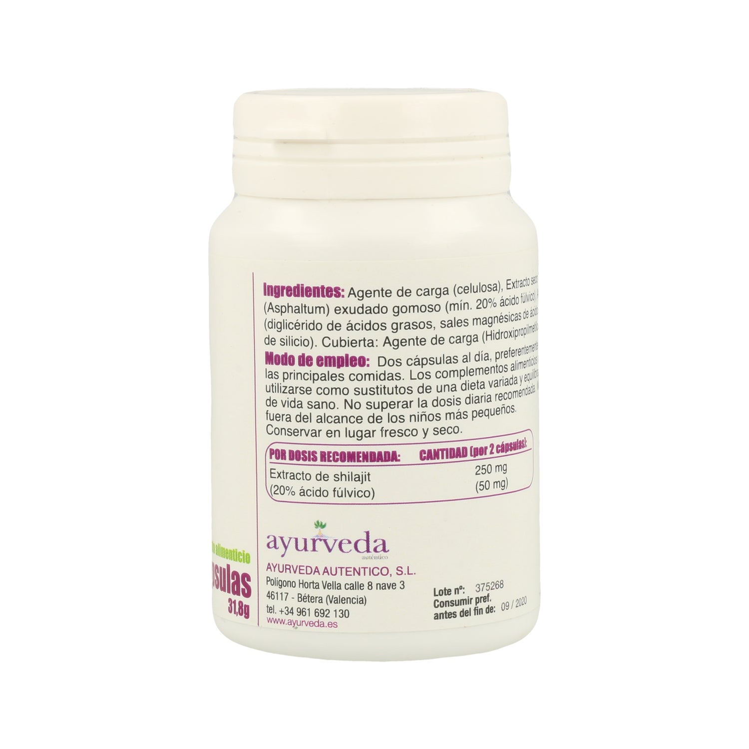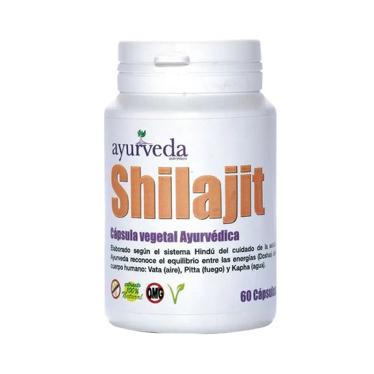 Agent de charge (cellulose), Extrait sec de shilajit (Asphaltum), exsudat gommeux (min. 20% acide fulvique), Extrait sec de racine d'Ashwagandha (Withania somnifera) (1,5% withanolides), Antiagglomérants (diglycéride d'acide gras, sels de magnésium d'acides gras, dioxyde de silicium), Enrobage : Agent de charge (hydroxypropyl méthylcellulose).