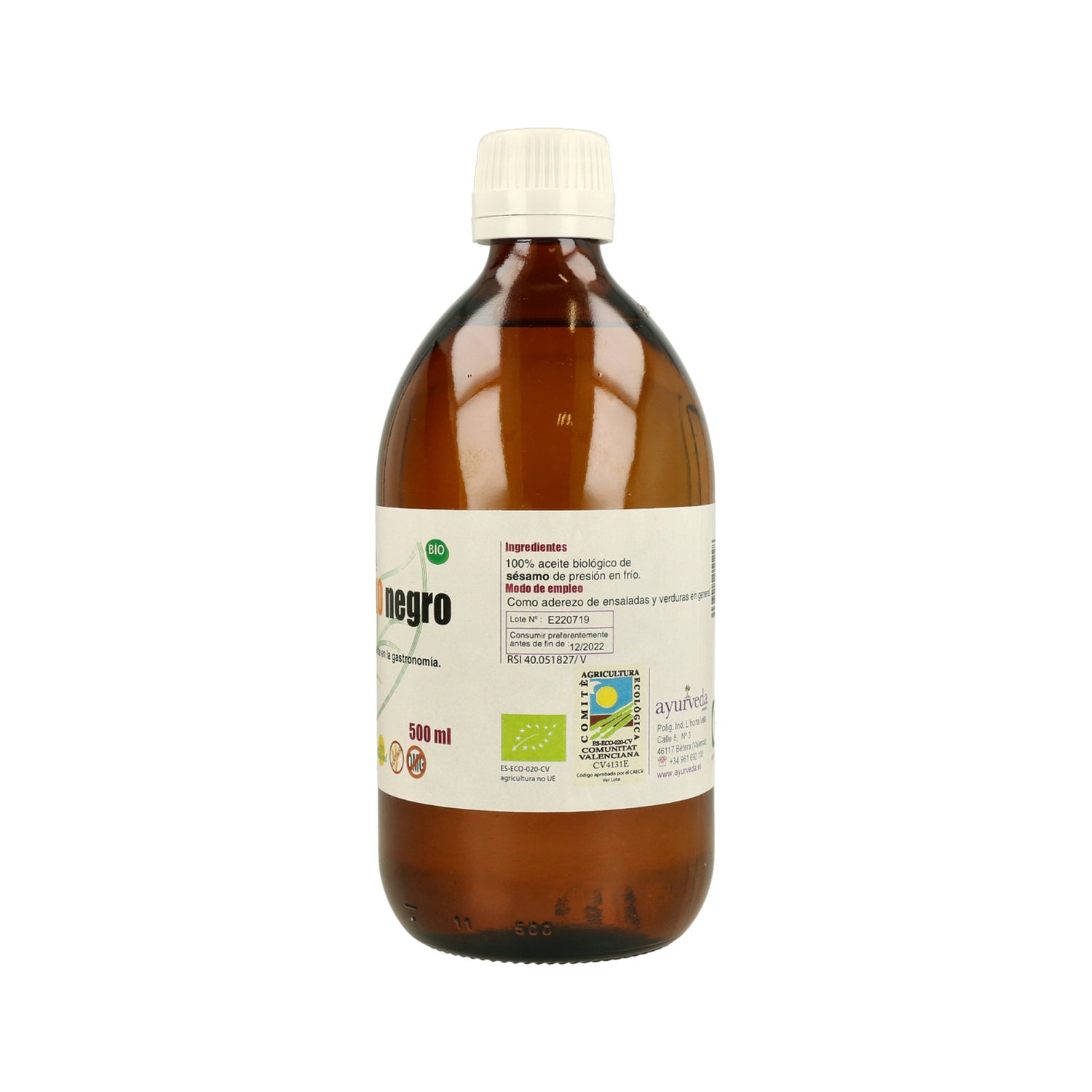 Huile de sésame noir extra vierge, adaptée à la gastronomie. Avec des anti-inflammatoires