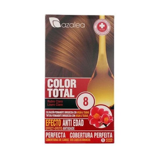 Azalea Tinte Color Total 8 est une coloration permanente en crème, idéale pour ceux qui souhaitent un changement de look professionnel à la maison. Sa formule, enrichie en huiles de Tsubaki et d'Argan, offre un blond clair lumineux et une couverture totale des cheveux blancs.