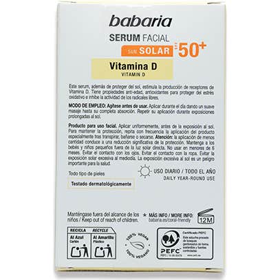 Babaria Sérum Facial Solaire Vitamine D SPF 50+ 30ml est un produit conçu pour prendre soin de la peau et fournir une haute protection solaire. Sa formule active les récepteurs de Vitamine D, ce qui contribue à offrir de la vitalité à la dermis. De plus, elle agit en inhibant l'activité des radicaux libres, ce qui aide à protéger la peau du stress oxydatif.
