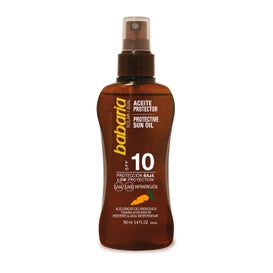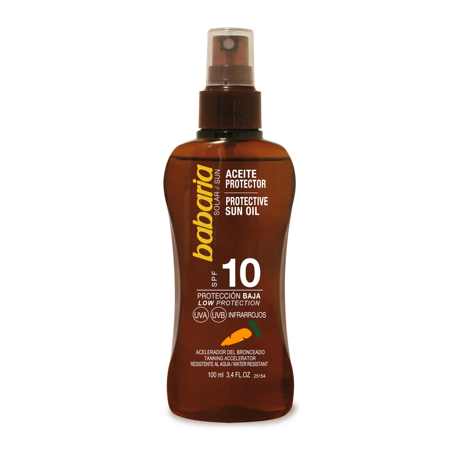 Huile de protection solaire en format spray, formulée avec de l'extrait de carotte, riche en bêta-carotène et des filtres protecteurs de la peau contre les rayons UVA, UVB et IR. Il contribue ainsi à obtenir un bronzage rapide et uniforme sans effets nocifs sur la peau. Il permet également d'hydrater, de nourrir, de soulager et de donner un aspect radieux à l'épiderme. Il est résistant à l'eau et convient à tous les types de peau. Facteur de protection SPF10.