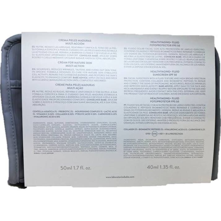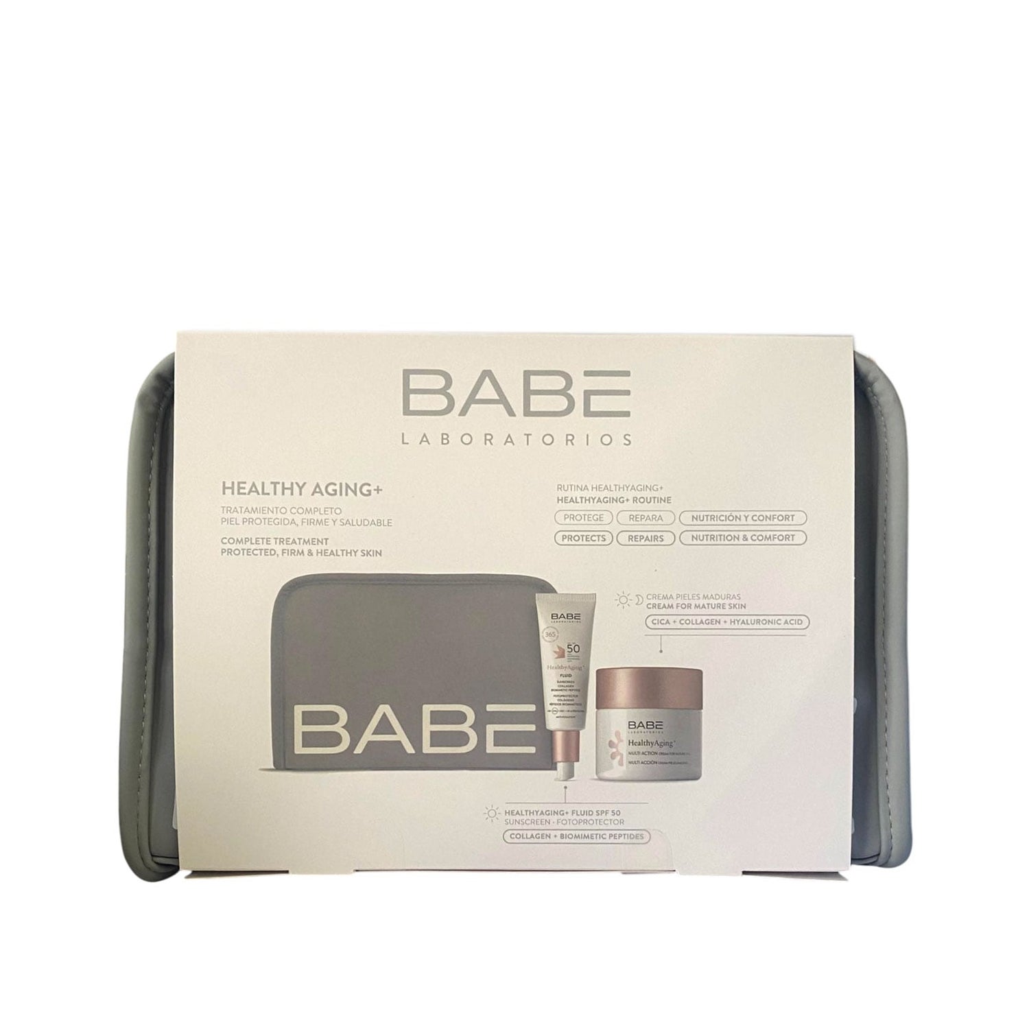 Babé Pack Healthy Aging+ Routine Multi-Action + Fluide SPF50 pour peaux matures réunit une routine quotidienne complète pour nourrir, raffermir et hydrater la peau, avec protection contre le vieillissement prématuré. Il comprend :