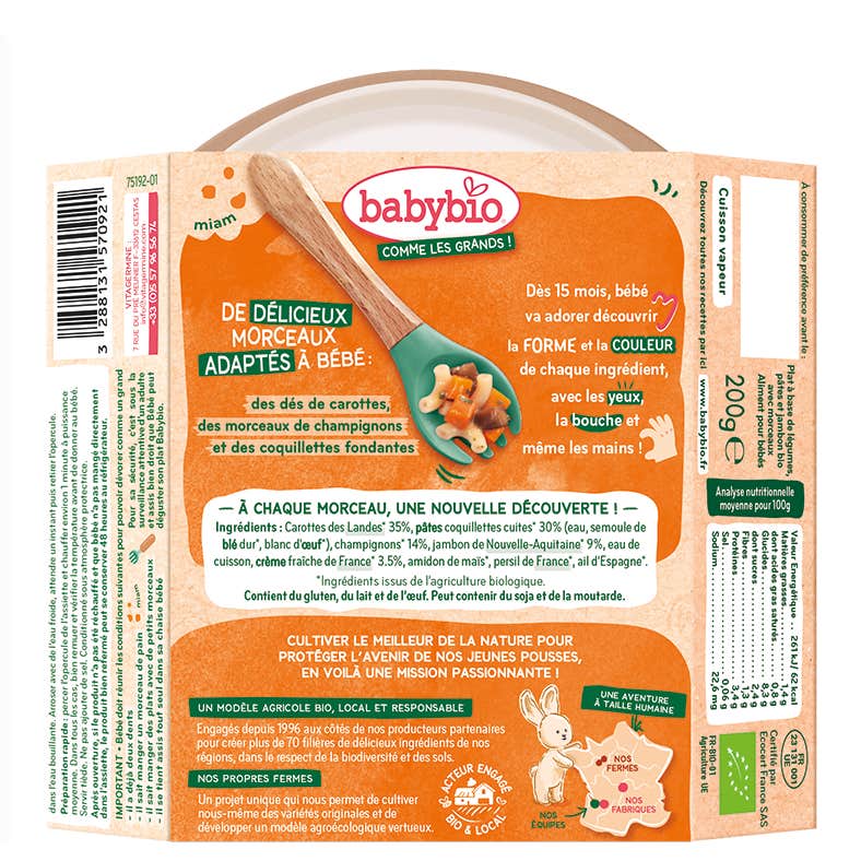 BabyBio Comme les Grands Carotte Coquillettes Champignon Jambon est un aliment conçu pour les bébés qui vise à rendre l'heure du repas une expérience amusante et éducative. Ce plat permet aux plus petits d'explorer différentes textures et saveurs tout en profitant d'un mélange d'ingrédients soigneusement sélectionnés.