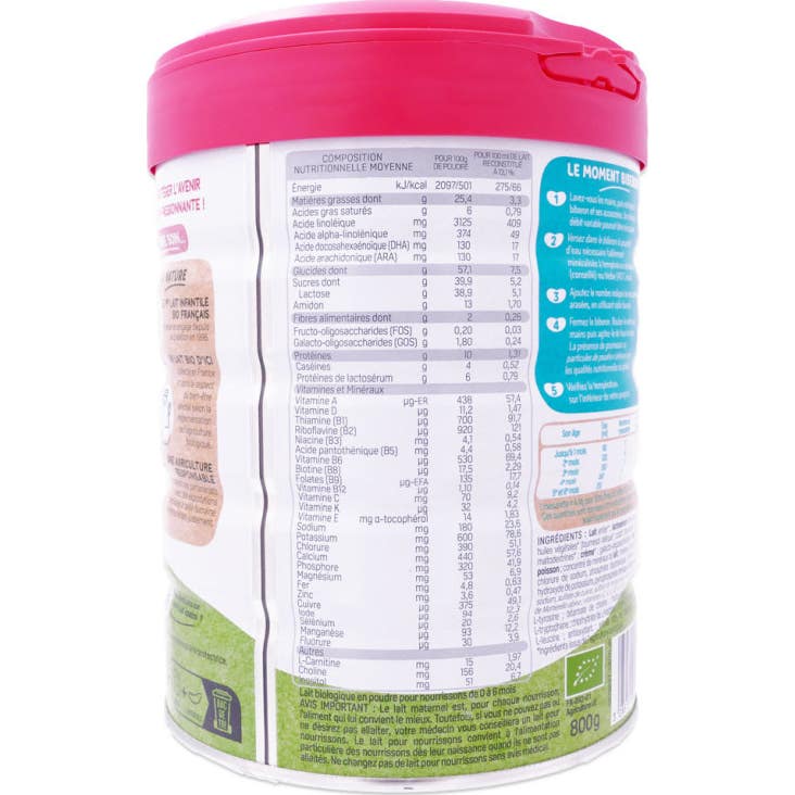 La formule de Optigest 1 est élaborée avec du lait entier biologique provenant de vaches nourries principalement à l'herbe et aux fourrages, garantissant le bien-être animal dans leur élevage. Cet aliment est fabriqué en France et convient dès la naissance ou comme complément à l'allaitement maternel.