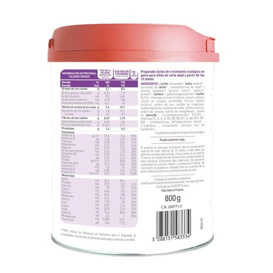 SKIMMED MILK, CORN MALTODEXTRINS, VEGETABLE OILS, (OLEIC SUNFLOWER, RAPESEED, SUNFLOWER), LACTOSE, GALACTOOLIGOSACCHARIDES (MILK) (6.7%), FISH OIL (MILK PROTEINS), MINERALS (POTASSIUM CITRATE, MAGNESIUM CHLORIDE, SODIUM CHLORIDE, FERROUS LACTATE, POTASSIUM HYDROXIDE, ZINC SULFATE, SODIUM SELENITE, CUPRIC SULFATE, MANGANESE SULFATE, POTASSIUM IODIDE), MILK MINERAL CONCÉNTRATE, MORTIERELLA ALPINA OIL, FRUCTOOLIGOSACCHARIDES (0.36%), VITAMINS (SODIUM L-ASCORBATE, CHOLECALCIFEROL, NICOTINAMIDE, RETINYL ACETATE, CALCIUM D-PANTOTHENATE, D-BIOTIN, PHYTOMENADIONE, THIAMIN MONONITRATE, PYRIDOXINE HYDROCHLORIDE, FOLIC ACID, D-ALPHA TOCOPHERYL ACETATE, DL-ALPHA TOCOPHEROL, 6 -L-ASCORBYL PALMITATE, CYANOCOBALAMIN, RIBOFLAVIN); L-CYSTINE, L-TRYPTOPHAN, BIFIDOBACTERIA (BIFIDOBACTERIUM LACTIS) 0.05%, EXTRACT RICH IN TOCOPHEROLS.