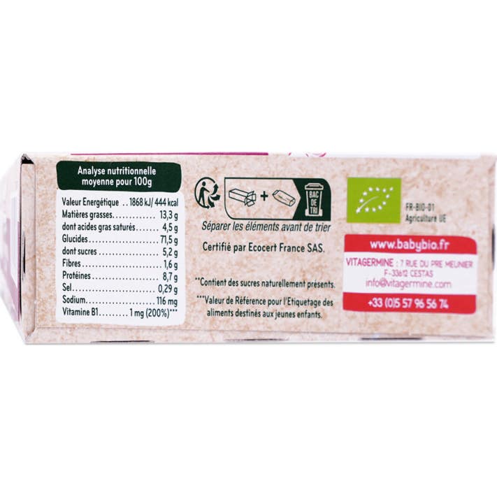 BabyBio Biscuits Emmental de Franche Comté & Thym est une délicieuse collation conçue spécialement pour les plus petits. Ces biscuits, élaborés avec du véritable fromage de Franche-Comté, sont idéaux pour satisfaire les petites envies des bébés. Leur taille s'adapte parfaitement aux mains et au palais des enfants, et leur combinaison de texture croustillante et fondante est irrésistible.