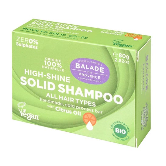 Balade en Provence Shampoo Solide Agrumes Brillance Bio 80 g est un produit conçu pour tous les types de cheveux. Ce shampooing solide se distingue par sa capacité à apporter un haut éclat grâce à sa combinaison de beurre de karité et d'huiles naturelles, qui offrent une finition douce et lumineuse.