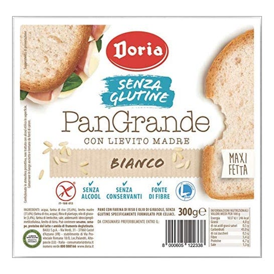 Bauli Doria Pangrande Bianco 300g est un pain à base de farine de riz et d'huile de tournesol sans gluten qui convient aux coeliaques.