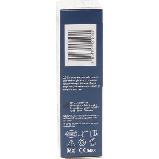 Bausch & Lomb Nereya Solution Ophtalmique Hydratante est un produit conçu pour fournir une hydratation intense et rapide à la surface oculaire. Cette solution contient acide hyaluronique sous forme d'hyaluronate de sodium, un composant naturel que l'on trouve dans l'œil humain sain et dans le film lacrymal. De plus, elle inclut :