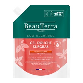 BeauTerra Gel Douche Surgras Monoï Eco-Recharge 1000ml est un gel d'hygiène quotidienne 3 en 1 pour le visage, le corps et les cheveux. Il nettoie en douceur et aide à protéger les peaux sensibles sujettes à la sécheresse, tout en maintenant l'équilibre naturel de la barrière cutanée.