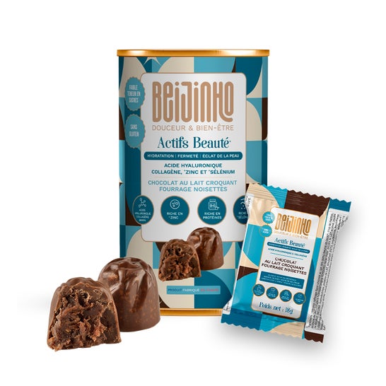 Beijinho Chocolat Au Lait Cacao Noisette Actifs Beauté 216g sont des chocolats au lait croustillants au cœur fondant de noisettes, enrichis en acide hyaluronique, collagène, zinc et sélénium, qui soutiennent l’hydratation et l’éclat de la peau.