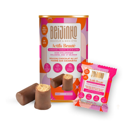 Beijinho Rouleaux Chocolat Au Lait Cacahuètes Actifs Beauté 160g sont des rouleaux gourmands sucrés salés enrichis en acide hyaluronique, collagène marin, zinc et sélénium, qui soutiennent l’hydratation et l’éclat de la peau.