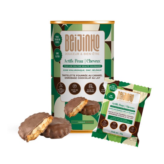 Beijinho Tartelette Chocolat Au Lait Caramel Peau & Cheveux 208g sont des tartelettes fourrées au caramel enrobées de chocolat au lait, enrichies en acide hyaluronique, zinc et sélénium, qui favorisent l’hydratation, renforcent la barrière cutanée et soutiennent la santé capillaire.