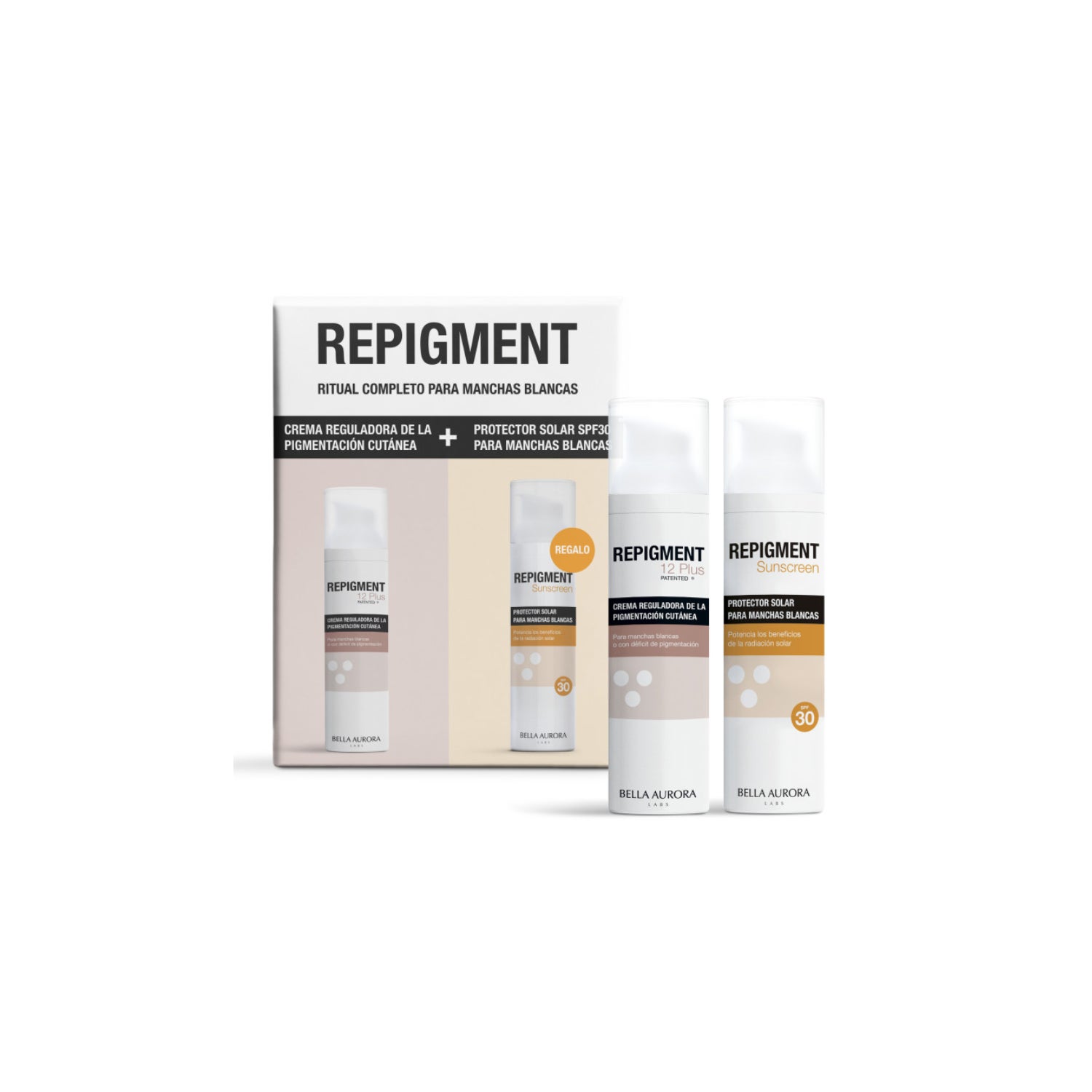 Bella Aurora Repigment 12 Plus 75 ml + Repigment Sunscreen 75 ml pour les taches blanches est un pack comprenant une crème repigmentante et un écran solaire spécifique. Il est indiqué pour aider à réguler la pigmentation cutanée et favoriser un teint plus uniforme en cas de hypopigmentation, comme les taches blanches sur le visage et le corps.