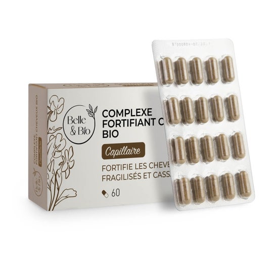Belle & Bio Complexe Fortifiant Cheveux Bio 60 Gélules est un complément alimentaire naturel conçu pour renforcer et revitaliser les cheveux fragilisés ou cassants, particulièrement lors des changements de saison.