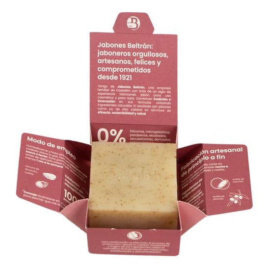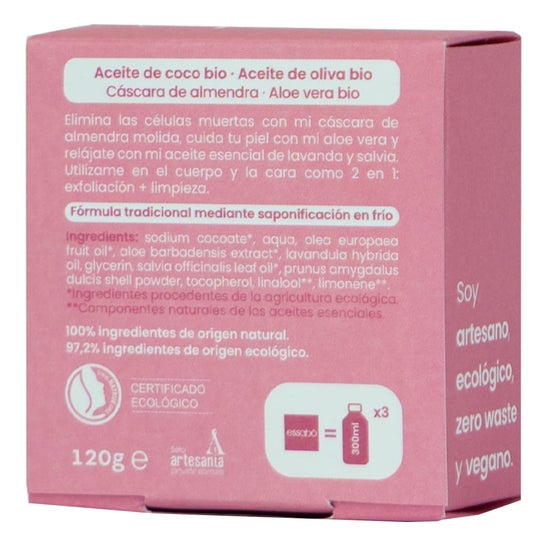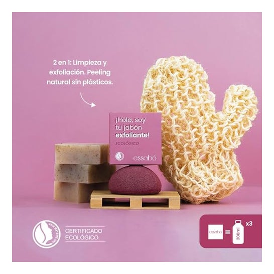 La barre cosmétique Essabó, fabriquée par Jabones Beltrán, agit comme un exfoliant grâce à ses composants naturels et biodégradables avec la certification Bio Inspecta. Ses nombreux ingrédients naturels comprennent de l'aloe vera biologique, des coquilles d'amandes moulues et des huiles de coco et d'olive. Elimine en douceur les cellules mortes de la peau et redonne éclat et fraîcheur à tous les types de peau.