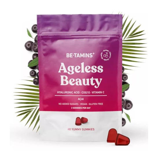 Betamins+ Ageless Beauty 60 unités est un complément alimentaire sous forme de gommes avec de l'acide hyaluronique, de la coenzyme Q10 et de la vitamine C qui aide à contrer les effets du temps sur la peau de l'intérieur.