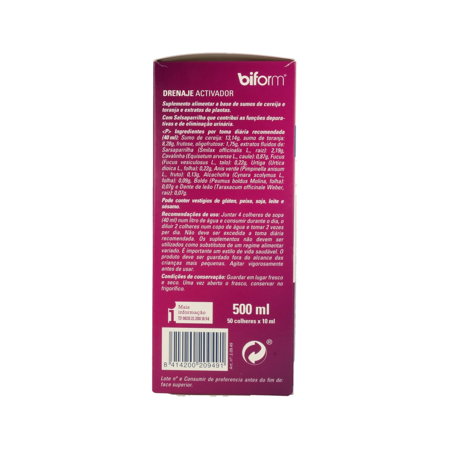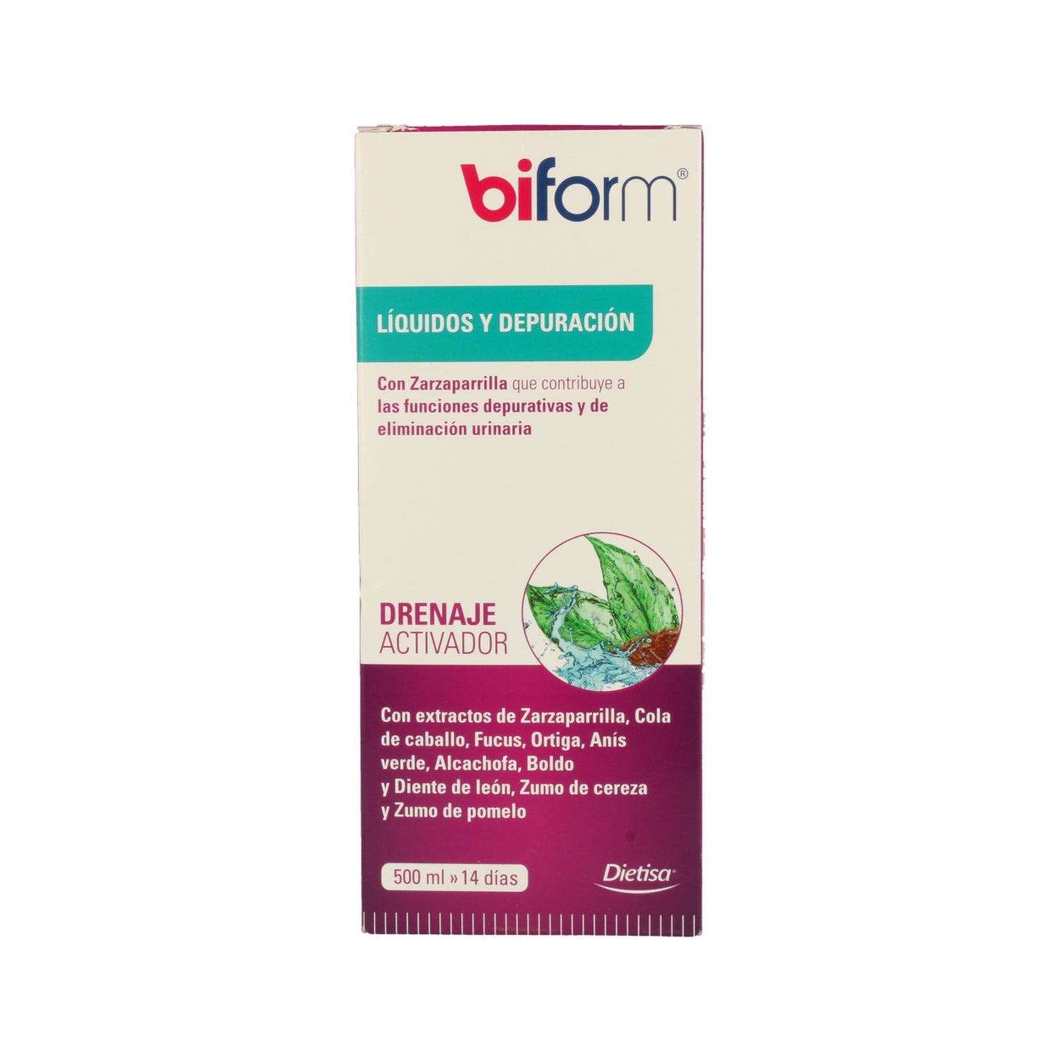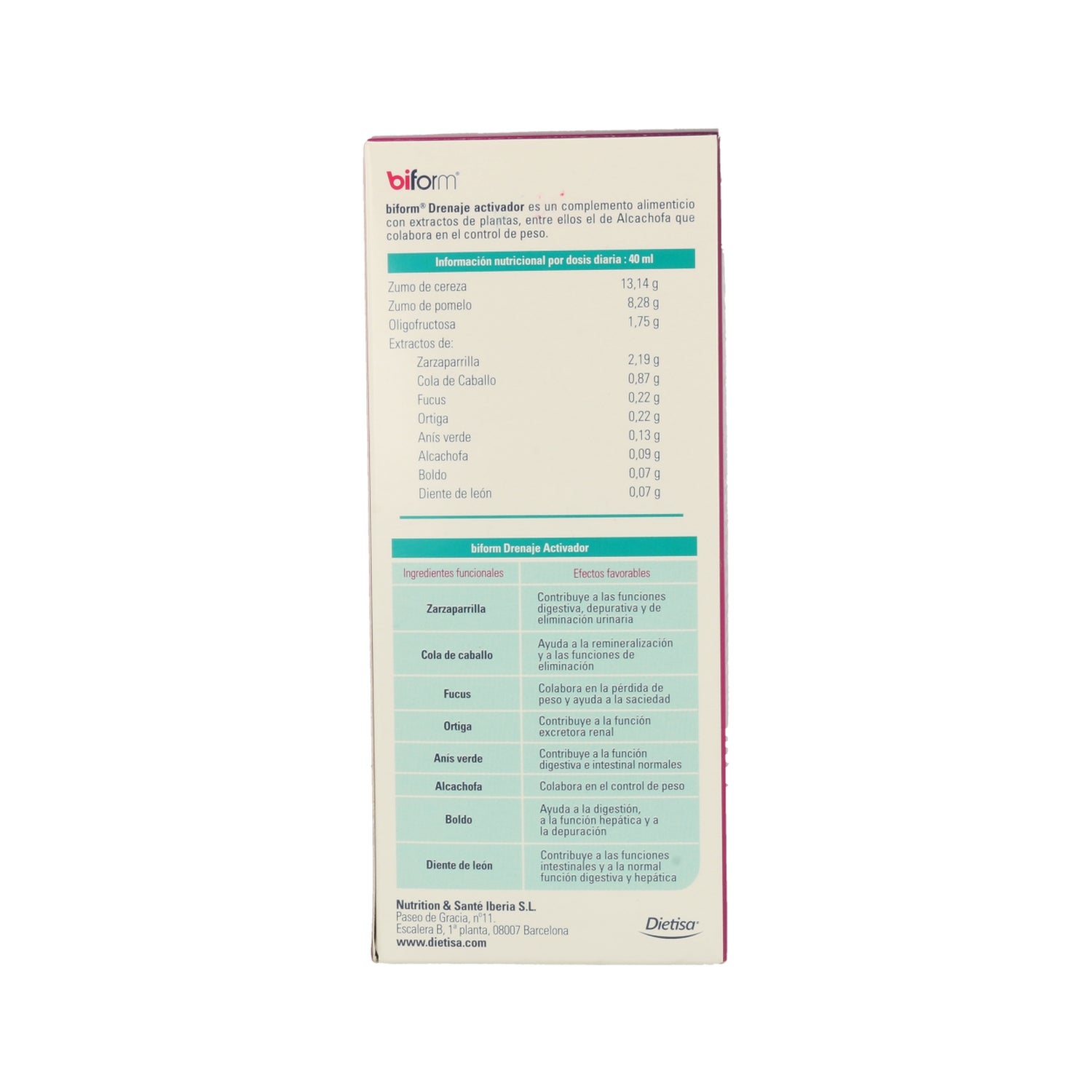 JUS DE CERISE ET DE PAMPLEMOUSSE, FRUCTOSE, OLIGOFRUCTOSE, EXTRAITS DE : SALSEPAREILLE, PRÊLE, ARTICHAUT, BOLDO, PISSENLIT, FUCUS, ORTIE ET ANIS VERT.