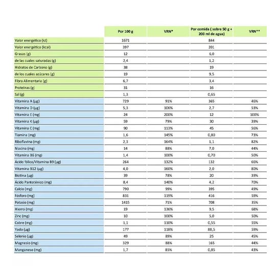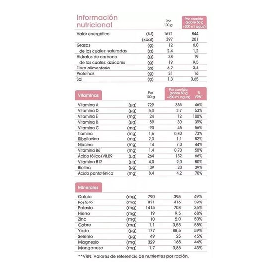 PROTÉINES DE SOJA (29%), FRUCTOSE, AMIDON, LAIT ÉCRÉMÉ EN POUDRE, HUILE VÉGÉTALE HYDROGÉNÉE, CACAO, SIROP DE GLUCOSE, INULINE (2,6%), MINÉRAUX CITRATE DE POTASSIUM, CHLORURE DE SODIUM, CARBONATE DE MAGNÉSIUM, PYROPHOSPHATE DE FER III, SULFATE DE ZINC, GLUCONATE DE CUIVRE, SÉLÉNITE DE SODIUM, SULFATE DE MANGANÈSE, IODURE DE POTASSIUM ; HUILE VÉGÉTALE, PROTÉINES DE LAIT, STABILISATEURS : CARRAGHÉNANE ET ESTERS LACTIQUES ET CITRIQUES DE MONO- ET DIGLYCÉRIDES D'ACIDES GRAS, ARÔMES DE NOISETTE ET DE CHOCOLAT, ANTI-AGGLOMÉRANT : PHOSPHATE TRICALCIQUE, ÉDULCORANTS : CYCLAMATE DE SODIUM ET SACCHARINE, ÉMULSIFIANT : LÉCITHINE DE SOJA, VITAMINES : C, E, NIACINE, A, AC. PANTOTHÉNIQUE, D3, B6, B2, B1, AC.FOLIC, BIOTINE, B12 ; ET ANTIOXYDANT : EXTRAIT RICHE EN TOCOPHÉROLS. AVEC ÉDULCORANTS