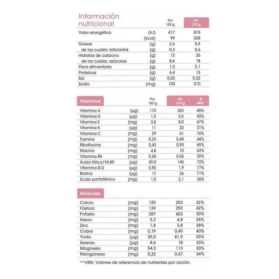 Lait écrémé, eau, sucre, protéines de lait (lécithine de soja), huile de colza, maltodextrine, amidon modifié, arôme, minéraux (citrates de sodium et de potassium, peroxyde d'hydrogène, peroxyde d'hydrogène) ;oxyde de potassium, phosphate de potassium, oxyde de magnésium, pyrophosphate de fer III, sulfate de zinc, sélénite de sodium, sulfate de cuivre, sulfate de manganèse, iodate de potassium), gélifiant (carragénine), vitamines : Acide L-ascorbique, DL-alpha-tocophérol (lactose, caséine), nicotinamide, acétate de rétinyle, cholécalciférol, pantothénate de calcium-D, chlorhydrate de pyridoxine, chlorhydrate de thiamine, riboflavine, cyanocobalamine, acide folique, D-biotine, colorant : bêta-carotène, édulcorant : acésulfame de potassium.