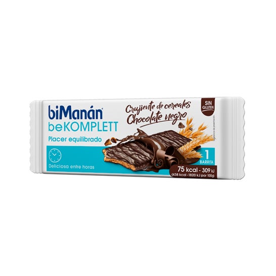 La barre croustillante biManán® Snack Chocolat Noir 1 Unité apporte seulement 75 kcal. Élaborée à base de céréales avec chocolat noir, c'est une source de fibres délicieuses et sans gluten.