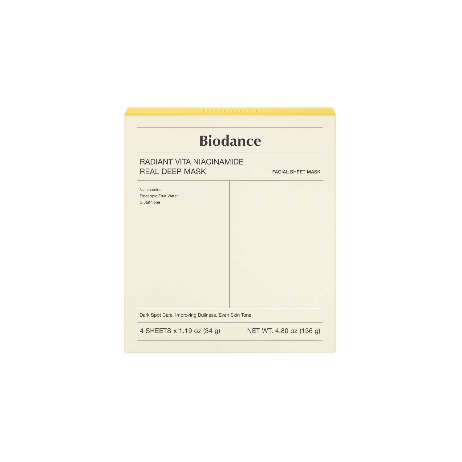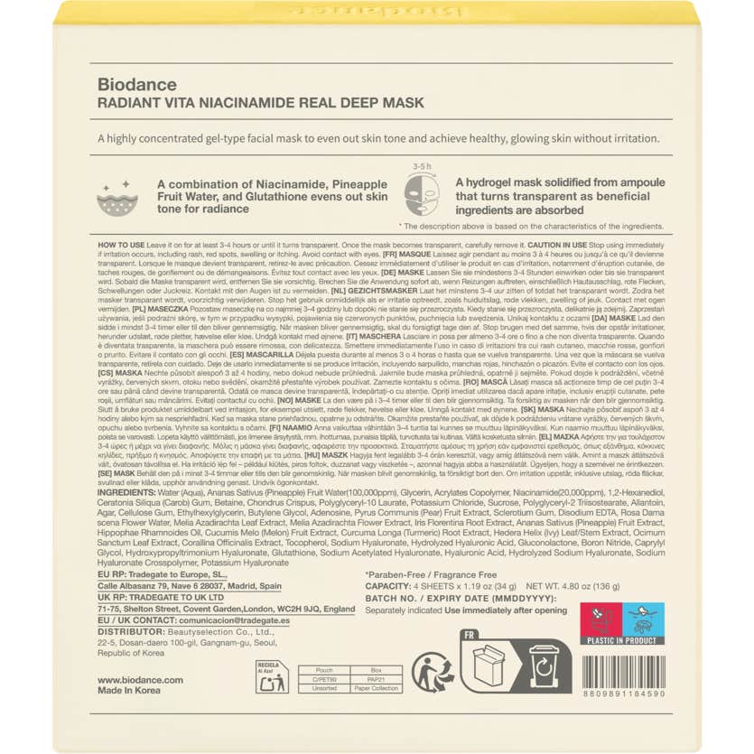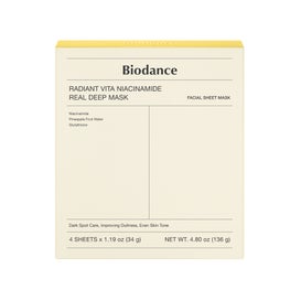 Biodance Radiant Vita Niacinamide Real Deep Masque 4x34 g est un masque en hydrogel intensif pour améliorer le teint irrégulier et l'apparence des taches sombres et du mélasma. Il combine niacinamide et glutathion de haute pureté pour apporter de la luminosité et unifier l'apparence de la peau en profondeur. Convient pour une utilisation diurne et nocturne.